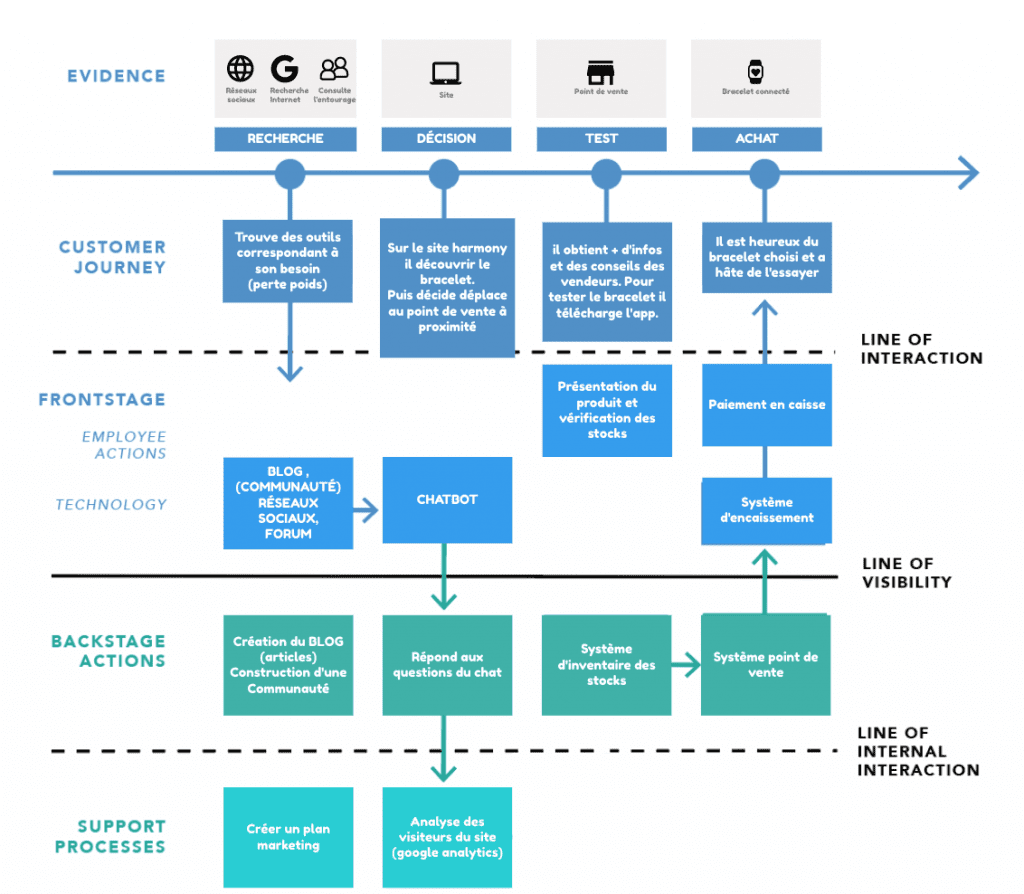 Creation of a blueprint service to define the user experience at the heart of the user journey, during the search for and purchase of the connected wristband enabling a personalized program and quality follow-up.